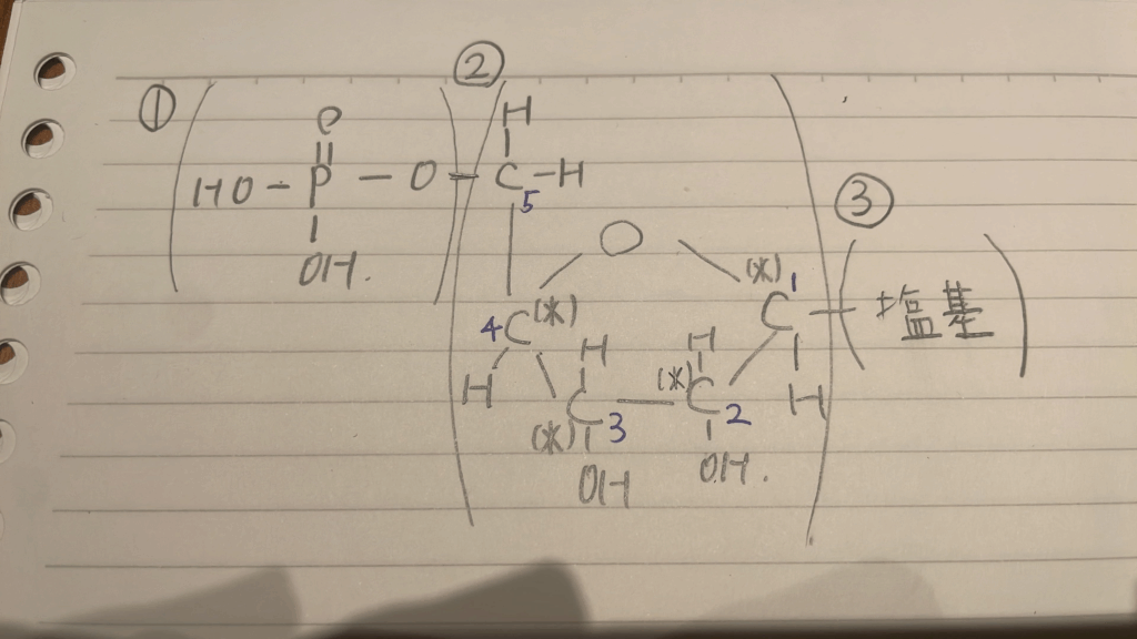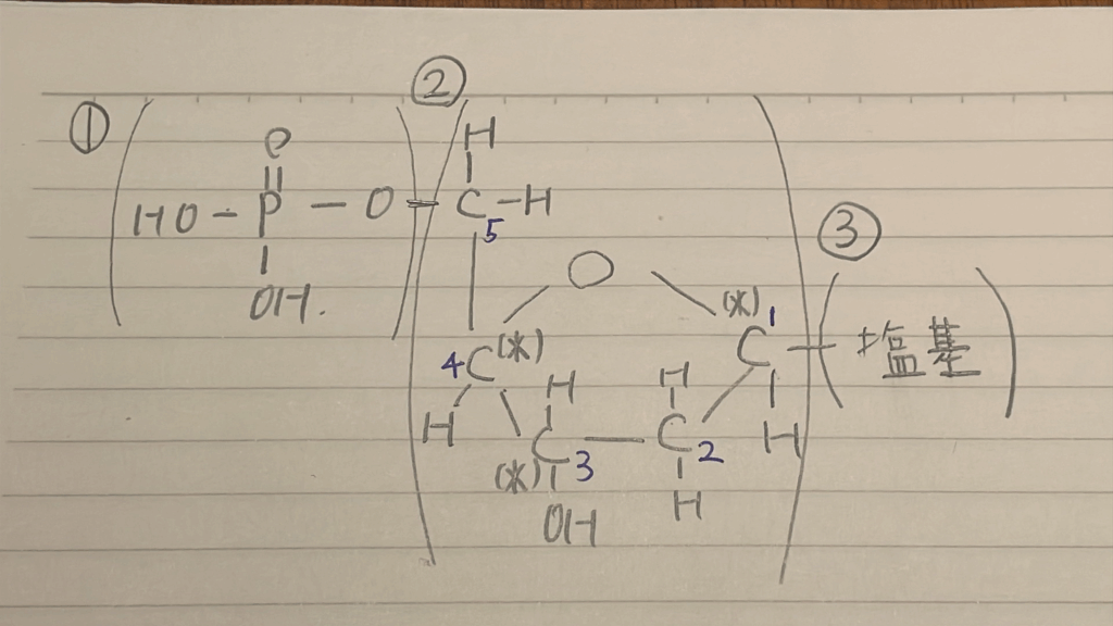 ①リン酸、②デオキシリボースorリボース、③塩基の3種類が合体したものがヌクレオチドです。