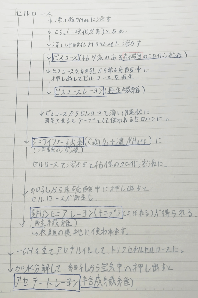 ビスコース、シュワイツァー試薬、銅アンモニアレーヨン、操作をして得られた繊維が再生繊維なのか、半合成繊維なのかを聞かれます。
