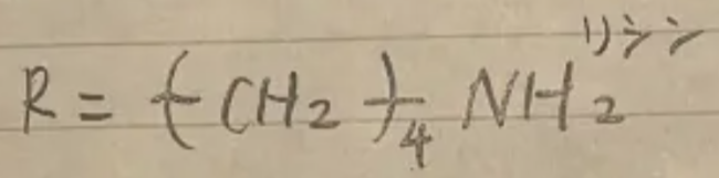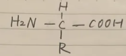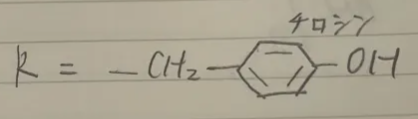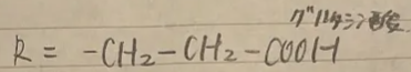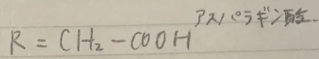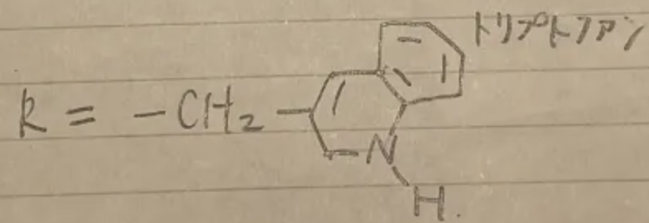 全てのアミノ酸はアミノ基、カルボキシ基、水素原子が炭素にくっつく共通の構造を持ち、側鎖(下図のR部分)が違うことで性質が異なります。構造決定の分子量計算では、共通部のC2H4NO2部分を瞬時に書き出しておくと計算が早いかもです