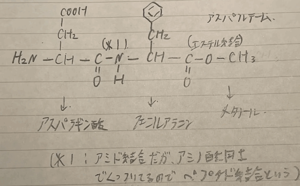これはアスパルテームと言われる物質です。覚えるものではないですが、構造決定で出たり、アミノ酸Aは、人工甘味料に使われる白色の結晶に含まれるといった具合に出ます。