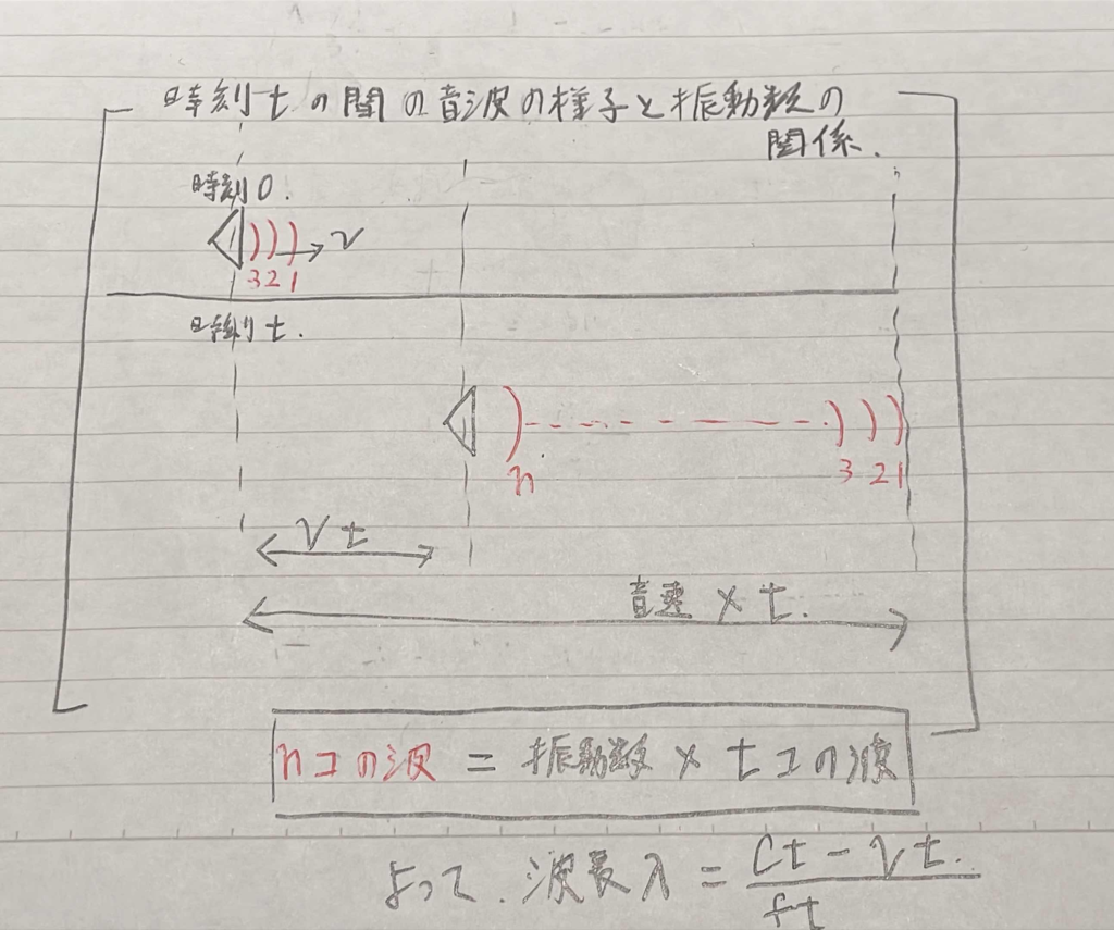 単位時間中の距離を使って説明してますが、音源だけが動くことを仮定して時間tの間に音源が出す状況で説明すると以下のようになります。