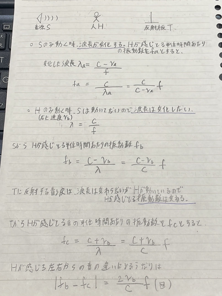 音を出している音源、または音を反射する反射板が動いたら音の波長が変化すること脳筋暗記でもいいので覚えましょう。音波の速度自体は不変だが、単位時間あたりに出される音波を含む距離が変化するので音波の音源に対する相対速度(単位時間で考えれば距離)を考える必要があります。