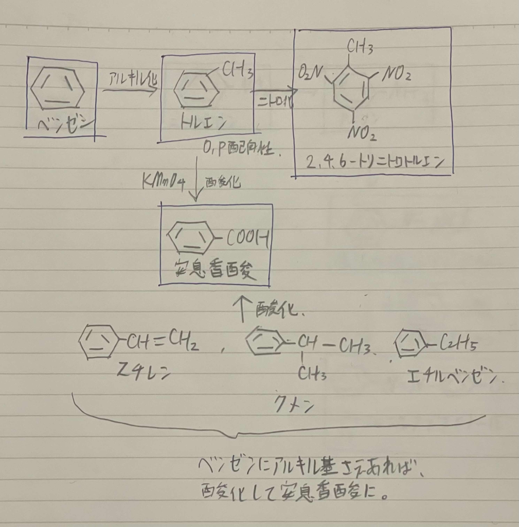 アルキル基を持つ芳香族化合物を酸化してCOOHを持つ物質を得る操作はよく問われます。