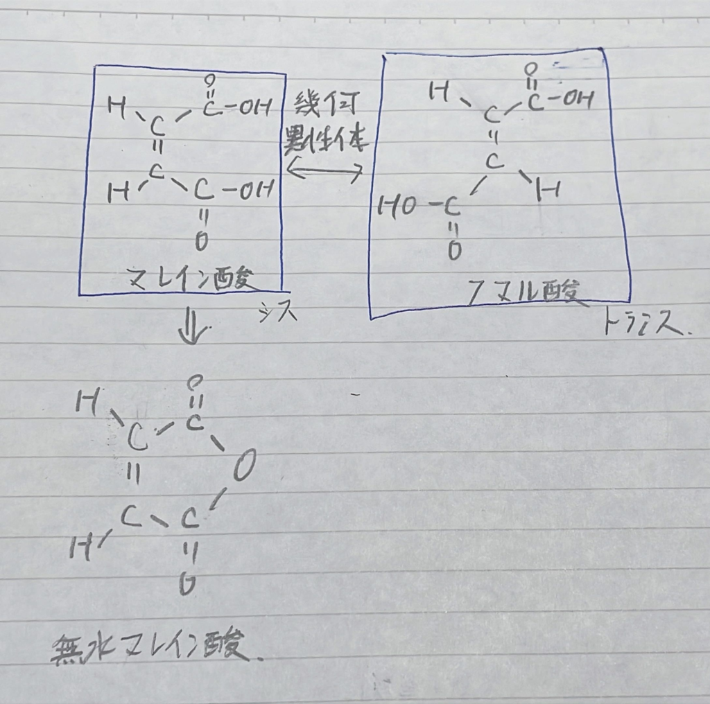 有名な語呂合わせで、トラにフマれてマレにシスがありますが、シス体のマレイン酸のみ脱水して無水物になるので無水マレイン酸とだけ覚えておきましょう。また、大学受験の範囲ではC4H4O4と分子式が与えられたら十中八九フマル酸かマレイン酸です。