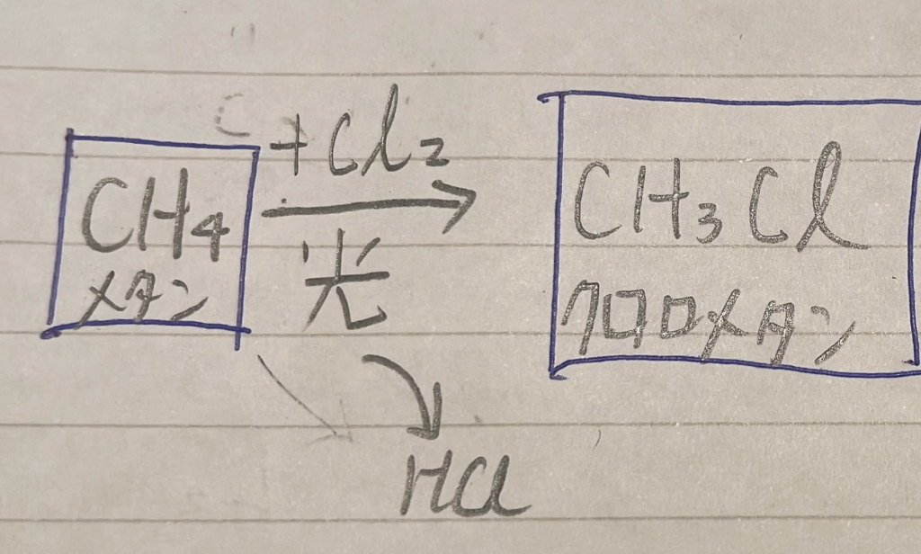 最終的にテトラクロロメタンまで炭素にくっついている水素原子が塩素に置換されていきます。