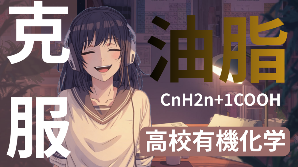 油脂の一般式(CnH2n+1COOH)は国立二次試験でも使えるので覚えておきましょう。アルカンの一般式CnH2nのH1個をカルボキシ基COOHに変えると覚えれば確実に記憶できるかと